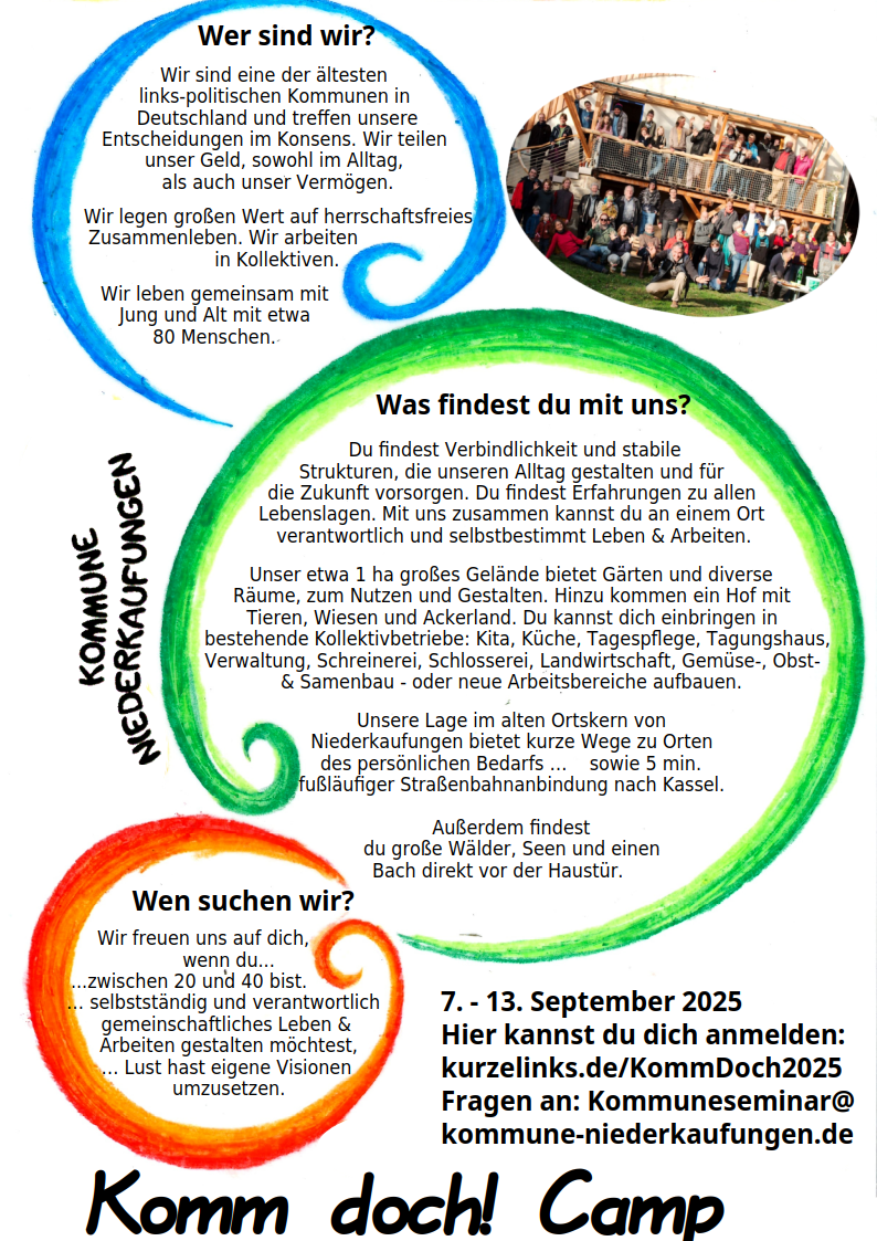 Daher laden wir dich herzlich vom 07.September bis 13. September 2025 zu unserem “Komm doch! Camp” ein. Zusammen mit circa 20 weiteren jungen Interessierten kannst du in diesen Tagen einen tiefen Einblick in die Kommune Niederkaufungen bekommen, Fragen stellen, Ideen spinnen und einfach eine gute Zeit erleben. Vielleicht kommt ja sogar eine ganze Gruppe mit gemeinsamem Einstiegsinteresse zustande?