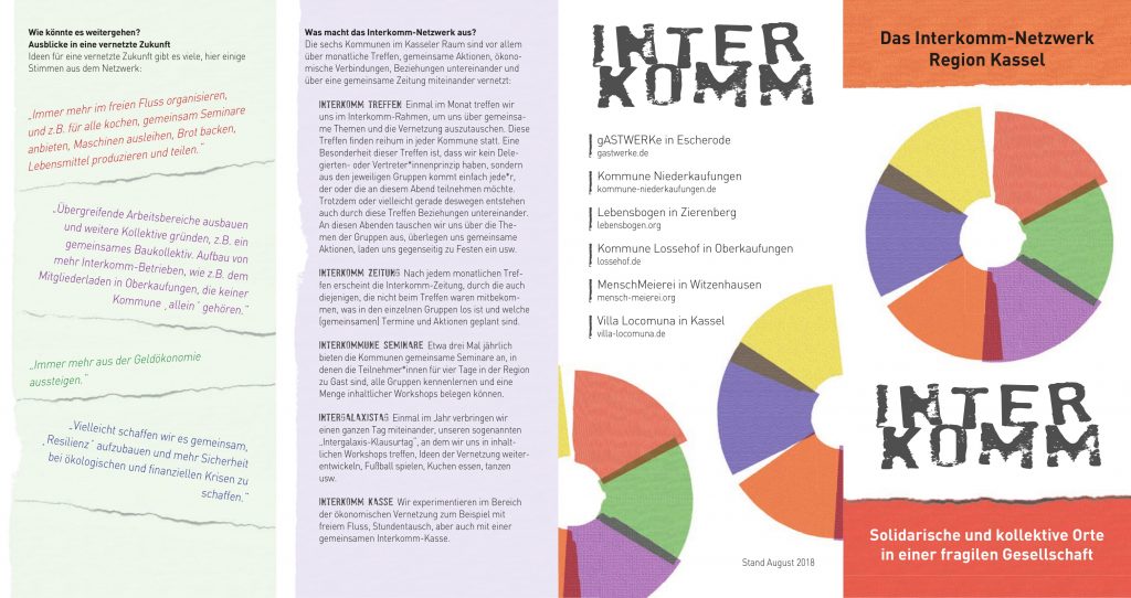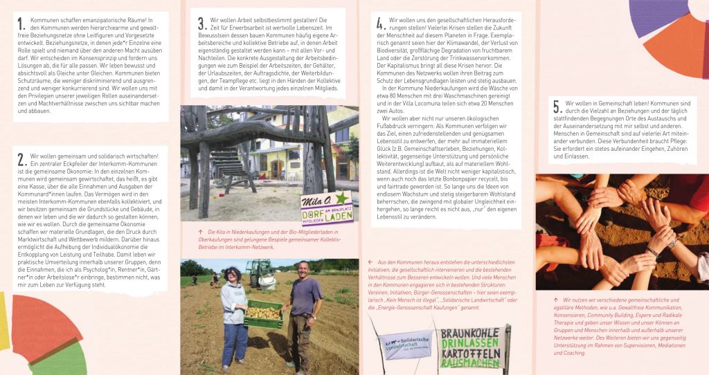 • übergreifende Arbeitsbereiche ausbauen und weitere Kollektive gründen, z.B. ein gemeinsames Baukollektiv. Aufbau von mehr Interkomm-Betrieben, – wie z.B. dem Mitgliederladen in Oberkaufungen – die keiner Kommune „allein“ gehören.“